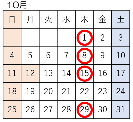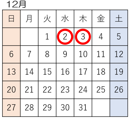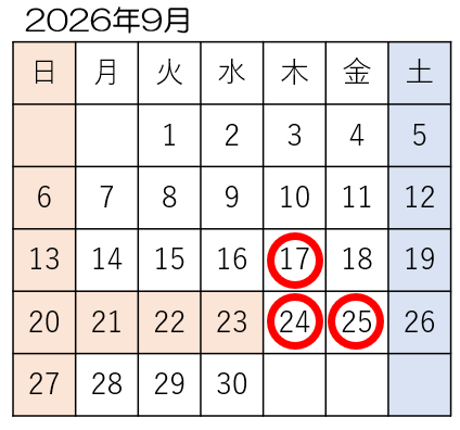 試験は、下記カレンダーの ○の日程で、本校会場またはオンラインで実施します。