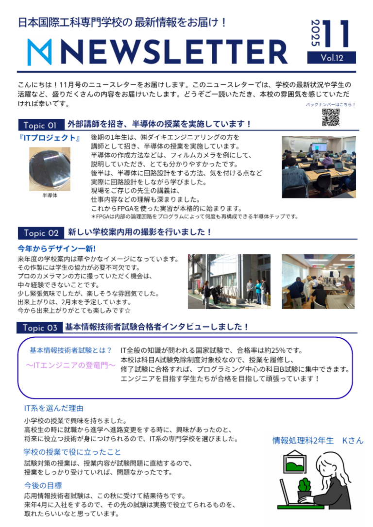 IT専門課程 2025年11月のニュースレターを公開しました 2025.12.08 本校IT専門課程(高度情報技術科4年制・高度情報処理科・情報処理科)の最新情報をお届けするニュースレターです。 2025年11月のニュースレターを発行しました。 画像をクリックしてごらんください。