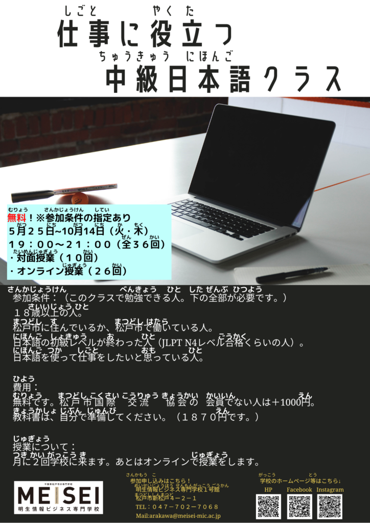 2021年度前期『仕事に役立つ中級日本語クラス』開講のお知らせ 2021.04.16 Facebook Twitter 明生情報ビジネス専門学校では、松戸市国際交流協会の委託を受けて、「仕事に役立つ中級日本語のクラス(全36回)」を今年も開きます!期間は5月25日~10月14日までの火曜日と木曜日です。時間は19時00分~21時00分です。(今期は夜間になります。)興味がございましたら、是非お気軽にお問合せ下さい。 以下言語別ポスター↓ English Tiếng việt 简体中文 詳しくはこちらまで↓https://www.meisei-mic.ac.jp/japanese/wp-content/uploads/2021/04/仕事に役立つ中級日本語要項0421.pdf申し込み用紙↓https://www.meisei-mic.ac.jp/japanese/wp-content/uploads/2021/04/21仕事に役立つ中級申込書.xlsx